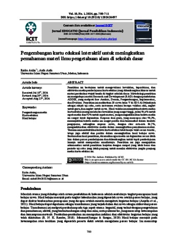 Aulia, Riska and Aufa, Aufa (2024) Pengembangan kartu edukasi interaktif untuk meningkatkan pemahaman materi ilmu pengetahuan alam di sekolah dasar. JPPI (Jurnal Penelitian Pendidikan Indonesia), 10 (1). ISSN 2502-8103