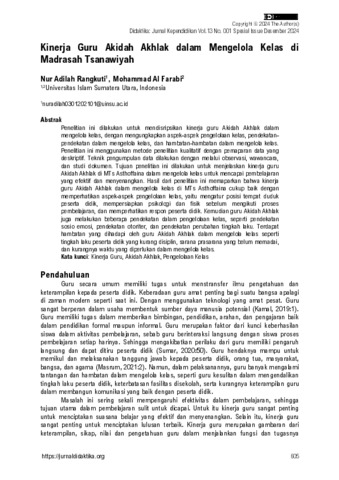 Adilah, Nur and Al Farabi, Mohammad Kinerja Guru Akidah Akhlak dalam Mengelola Kelas di Madrasah Tsanawiyah. Didaktika: Jurnal Kependidikan. ISSN 2745-4312