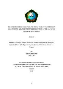 Putri, Dini Atika (2018) The Effect of Beyond Centers and Circle Time (BCCT) Method on the Students’ ability in Writing Recount Text at the Eleventh grade of MAN 3 Medan. Skripsi thesis, Universitas Islam Negeri Sumatera Utara.