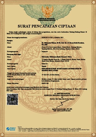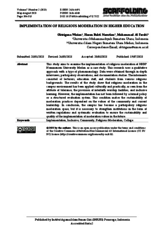 Wirian, Oktrigana and Nasution, Hasan Bakti and Farabi, Mohammad Al (2025) Implementation Of Religious Moderation In Higher Education. Scaffolding: Jurnal Pendidikan Islam dan Multikulturalisme, 7 (2). pp. 304-315. ISSN P 2656-4548 E 2656-4491