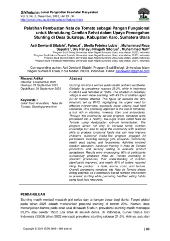 Silalahi, Asti Dewianti and Fahrozi, Fahrozi and Lubis, Shella Febrina and Saputra, Muhammad Reza and Sitorus, Sry Rahayu Ningsih and Nuh, Muhammad (2025) Pelatihan Pembuatan Nata de Tomato sebagai Pangan Fungsional untuk Mendukung Camilan Sehat dalam Upaya Pencegahan Stunting di Desa Sukatepu, Kabupaten Karo, Sumatera Utara. Shihatuna: Jurnal Pengabdian Kesehatan Masyarakat, 5 (2). pp. 83-94.