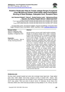 Stunting remains a serious public health problem worldwide. Globally, its prevalence reaches 23.2%, while in Indonesia in 2024 it was recorded at 19.8%. The situation in Sukatepu Village is even more alarming, with 43.5% of children aged 24–50 months affected. This figure far exceeds the 20% threshold set by WHO, highlighting the urgent need for effective interventions, especially those utilizing local food resources. One promising approach is the use of tomatoes, a fruit rich in vitamins, minerals, fiber, and antioxidants. Through this community service program, tomatoes were processed into a healthy, low-sugar snack called Nata de Tomato using Acetobacter xylinum fermentation. The program aimed not only to increase family nutrition knowledge but also to equip the community with practical skills to produce functional foods that can help improve children’s nutritional intake.The program engaged 23 participants, including teenage girls, posyandu (community health post) cadres, and housewives. Activities involved nutrition education, hands-on training in Nata de Tomato production, and sensory testing to evaluate product acceptance. Results were encouraging: 80% of participants successfully produced Nata de Tomato according to standard procedures, their understanding of nutrition significantly improved, and nearly 95% of tasters reported liking the product ’ s taste, aroma, color, and texture. Overall, processing tomatoes into Nata de Tomato shows strong potential as a community-based nutrition intervention to prevent stunting while promoting healthier eating habits using local food resources.