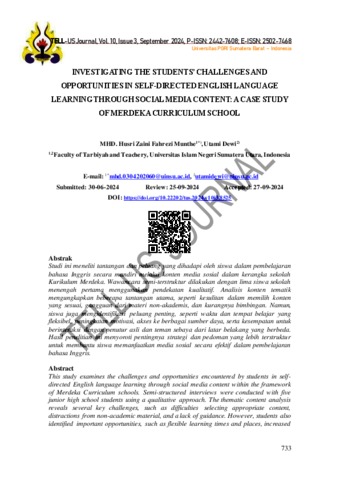 Zaini Fahrezi Munthe, Husri and Dewi, Utami Investigating The Students’ Challenges And Opportunities In Self-Directed English Language Learning Through Social Media Content: A Case Study Of Merdeka Curriculum School. Universitas PGRI Sumatera Barat – Indonesia. ISSN 2502-7468