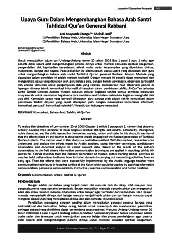 Untuk mewujudkan tujuan dari Undang-Undang nomor 20 tahun 2003 Bab 1 pasal 1 ayat 1 yaitu agar peserta didik secara aktif mengembangkan potensi dirinya untuk memiliki kekuatan spiritual keagamaan, pengendalian diri, kepribadian, kecerdasan, akhlak mulia, serta keterampilan yang diperlukan dirinya, masyarakat, bangsa dan negara. Pada penelitian ini ditemukanlah upaya-upaya yang dilakukan oleh guru untuk mengembangkan bahasa arab santri Tahfidzul Qur’an generasi Rabbani. Adapun Metode yang digunakan dalam penelitian ini adalah metode kualitatif. Dengan metode ini peneliti dapat memahami dan menganalisis upaya yang dilakukan oleh guru bahasa arab, dengan teknik wawancara, observasi partisipatif dan analisis dokumen untuk pengumpulan data yang relevan. Berdasarkan hasil Observasi penulis di lapangan dimana teknik komunikasi informatif di terapkan dalam pembinaan tahfidz Al-Qur‟an terhadap santri Tahfidz Generasi Rabbani Medan, sebelum dimulai kegiatan tahfidz semua pembina melakukan musyawarah untuk membahas bagaimana cara membina santri dalam melakukan kegiatan menghafal dari usia dini. Kemudian upaya yang berhasil diterapkan guru bahasa arab adalah teknik komunikasi dalam pembinaan tahfidz Alquran yang dapat diterapkan yaitu dengan menerapkan komunikasi informatif, komunikasi persuasif, komunikasi instruktif / Koersif, dan hubungan manusiawi.
