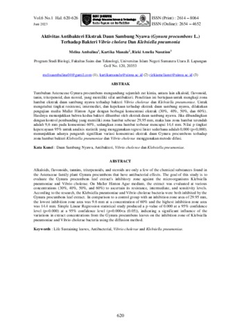 Ambalina, Melisa and Manalu, Kartika and Nasution, Rizki Amelia (2023) Aktivitas Antibakteri Ekstrak Daun Sambung Nyawa (Gynura Procumbens L.) terhadap Bakteri Vibrio Cholera dan Klebsiella Pneumonia. Best Journal: Biology Education, Sains and Technology, 6 (1). pp. 620-626. ISSN 2654 – 4652